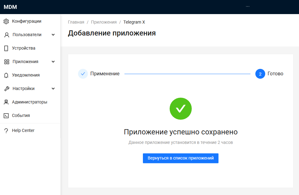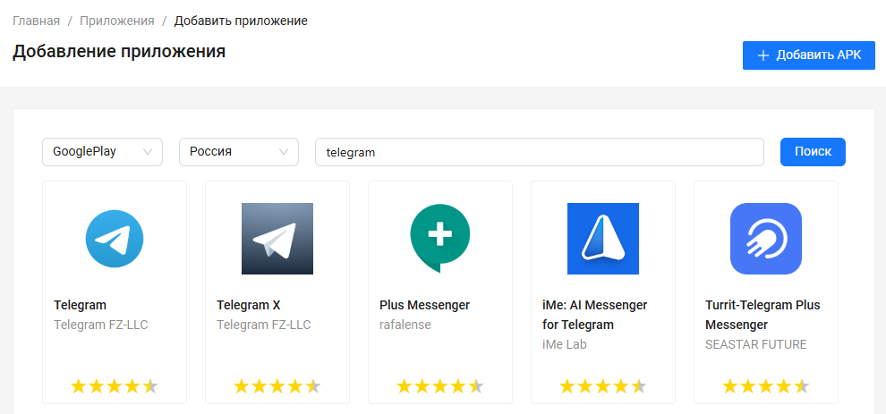 Администратор может добавить в систему приложения из App Store и Google Play.