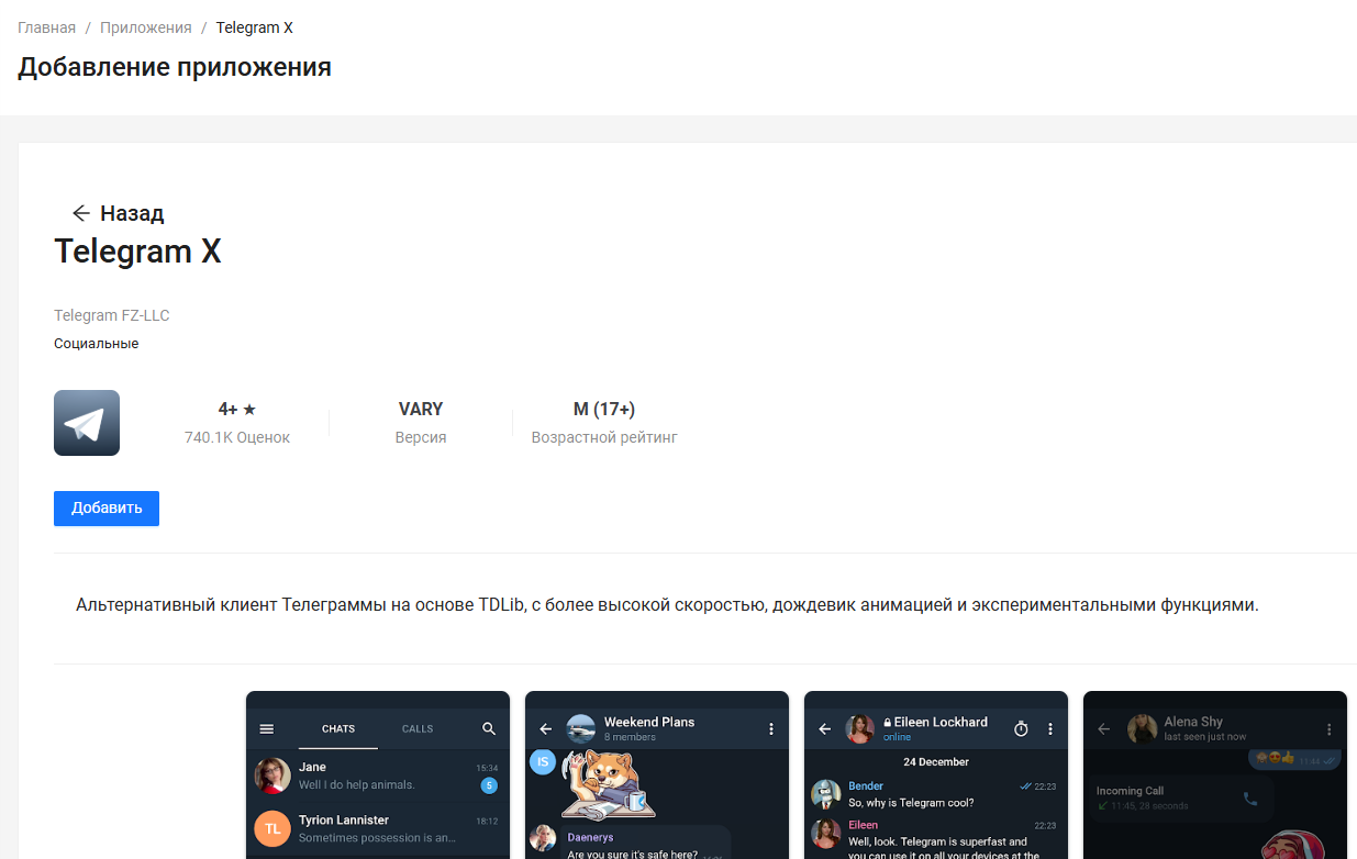 На странице с описанием приложения нажать кнопку Добавить. Это запустит процесс добавления приложения на систему.