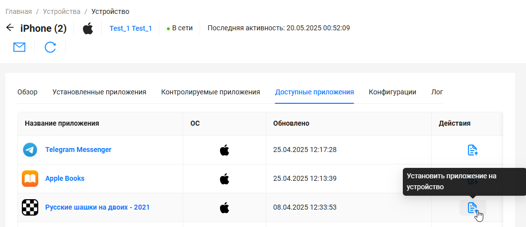 1. Администратор в карточке устройства - во вкладке “Доступные приложения” нажимает кнопку “Установить приложение на устройство”. Если приложение уже установлено, то пользовать увидит окно с предложением передать управление приложением.