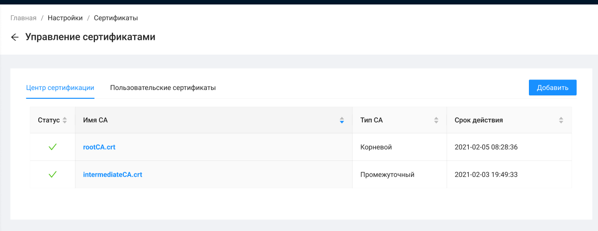 Функционал центра сертификации располагается в Настройках - разделе Сертификаты.
