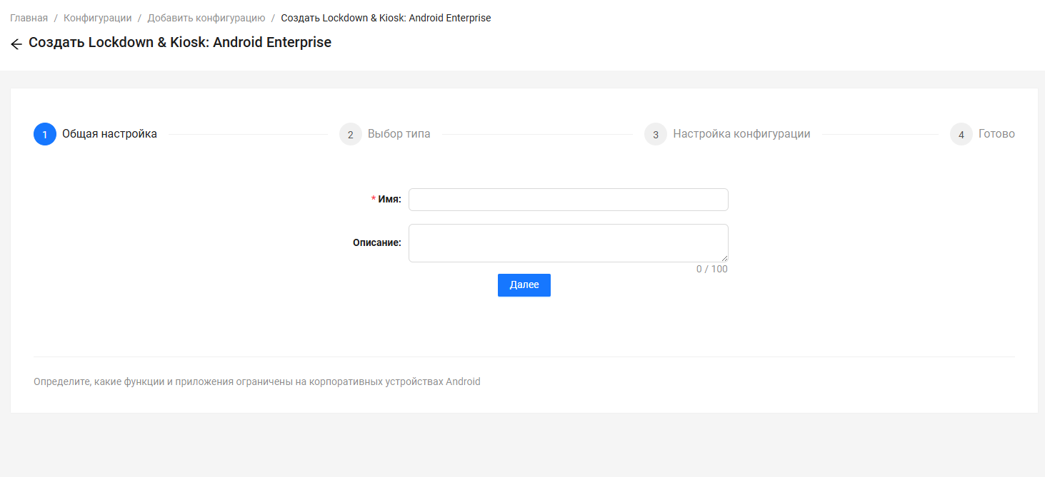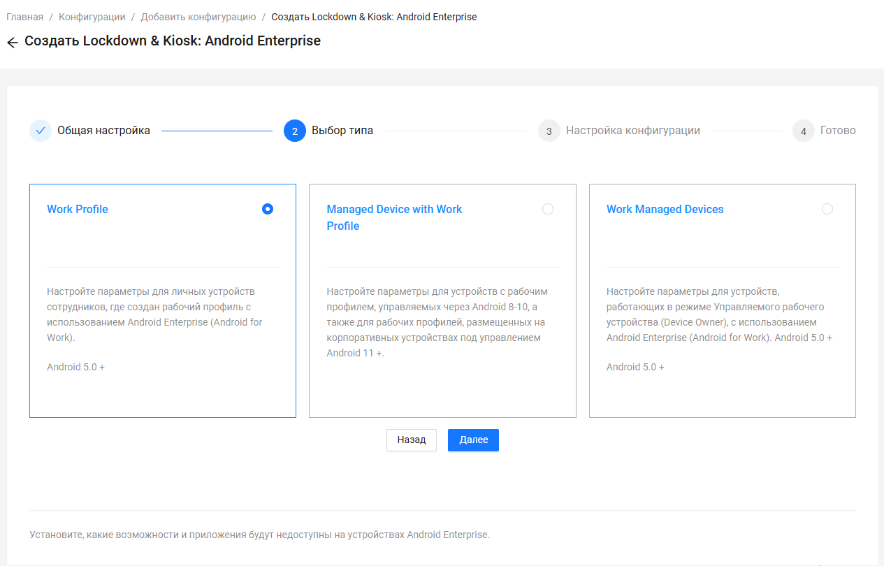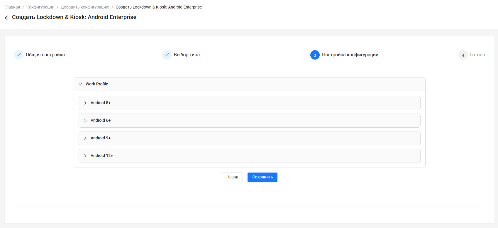 На этом этапе администратор настраивает все ограничения и параметры для устройств Android. После настройки параметров конфигурации нажмите “Сохранить”.