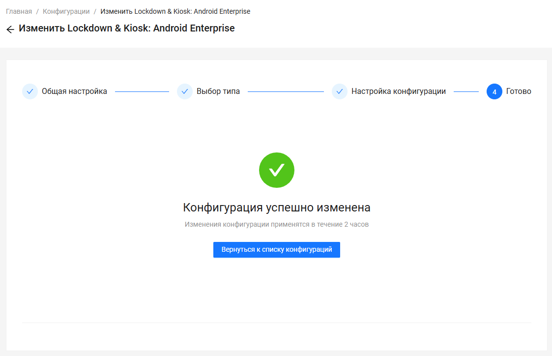 После применения настроек система уведомляет об успешном сохранении с сообщением “Конфигурация успешно сохранена” и зеленой отметкой. Для возврата к списку конфигураций доступна кнопка “Вернуться к списку конфигураций”.
