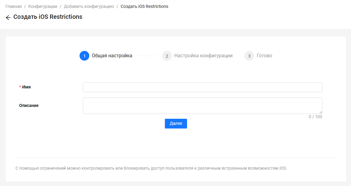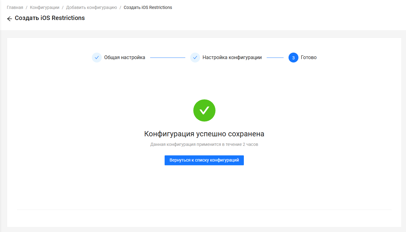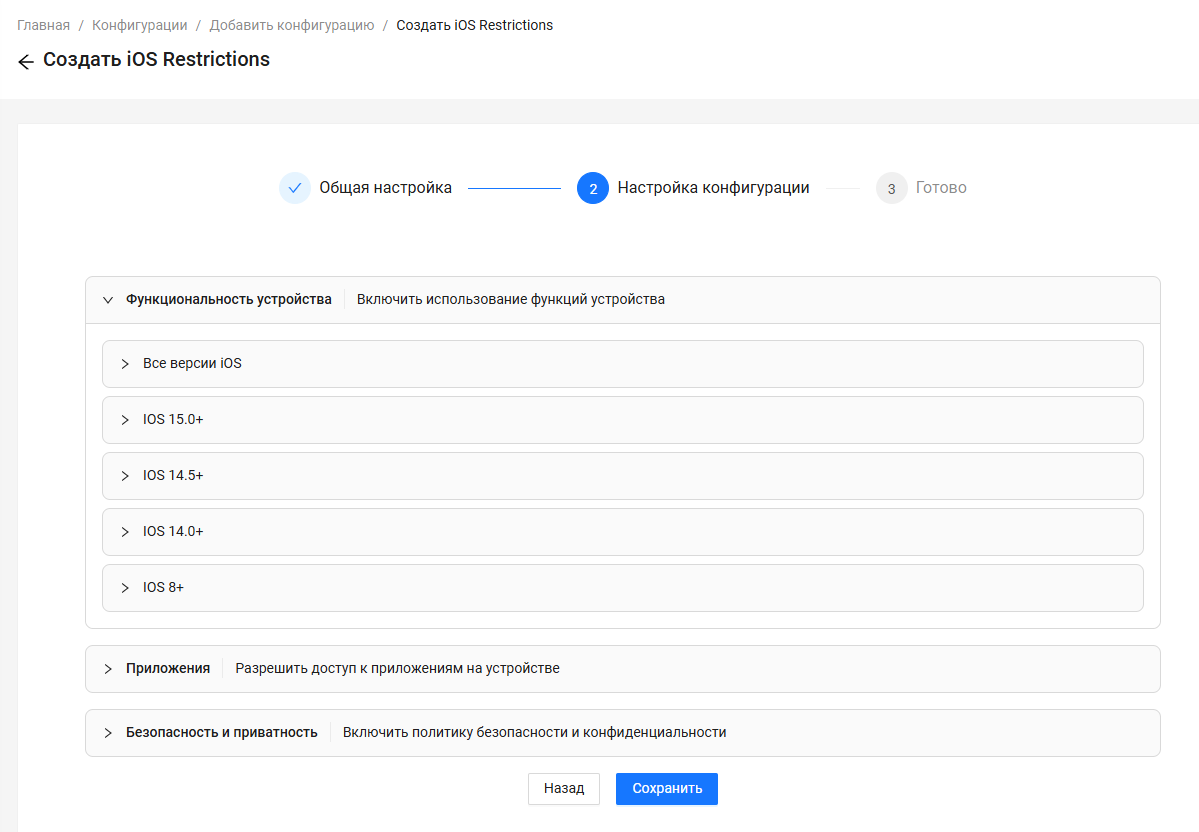 На этом этапе администратор настраивает все ограничения и параметры для устройств iOS. После настройки параметров конфигурации нажмите “Сохранить”.