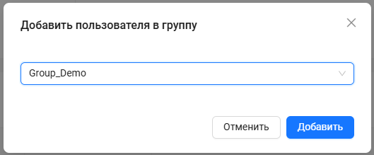 При нажатии на кнопку добавления группы открывается модальное окно, в котором нужно выбрать группу для добавления пользователя и нажать кнопку “Добавить”.