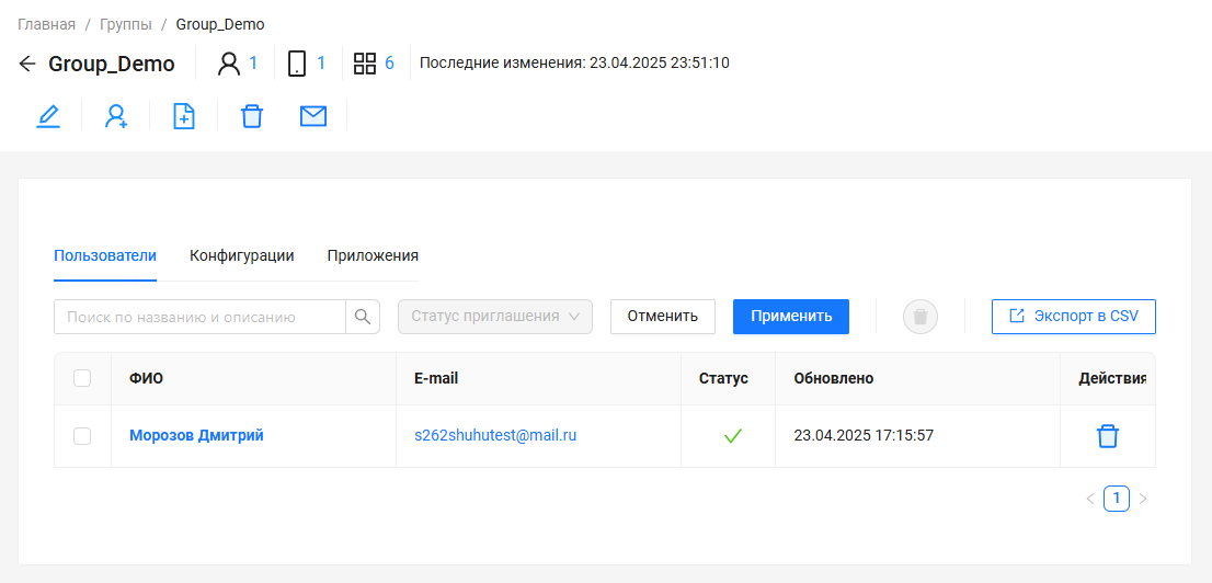 - Экспорт списка сотрудников. При нажатии на кнопку Экспорт в CSV, будет скачан файл с данными по всем сотрудникам добавленным в группу.
