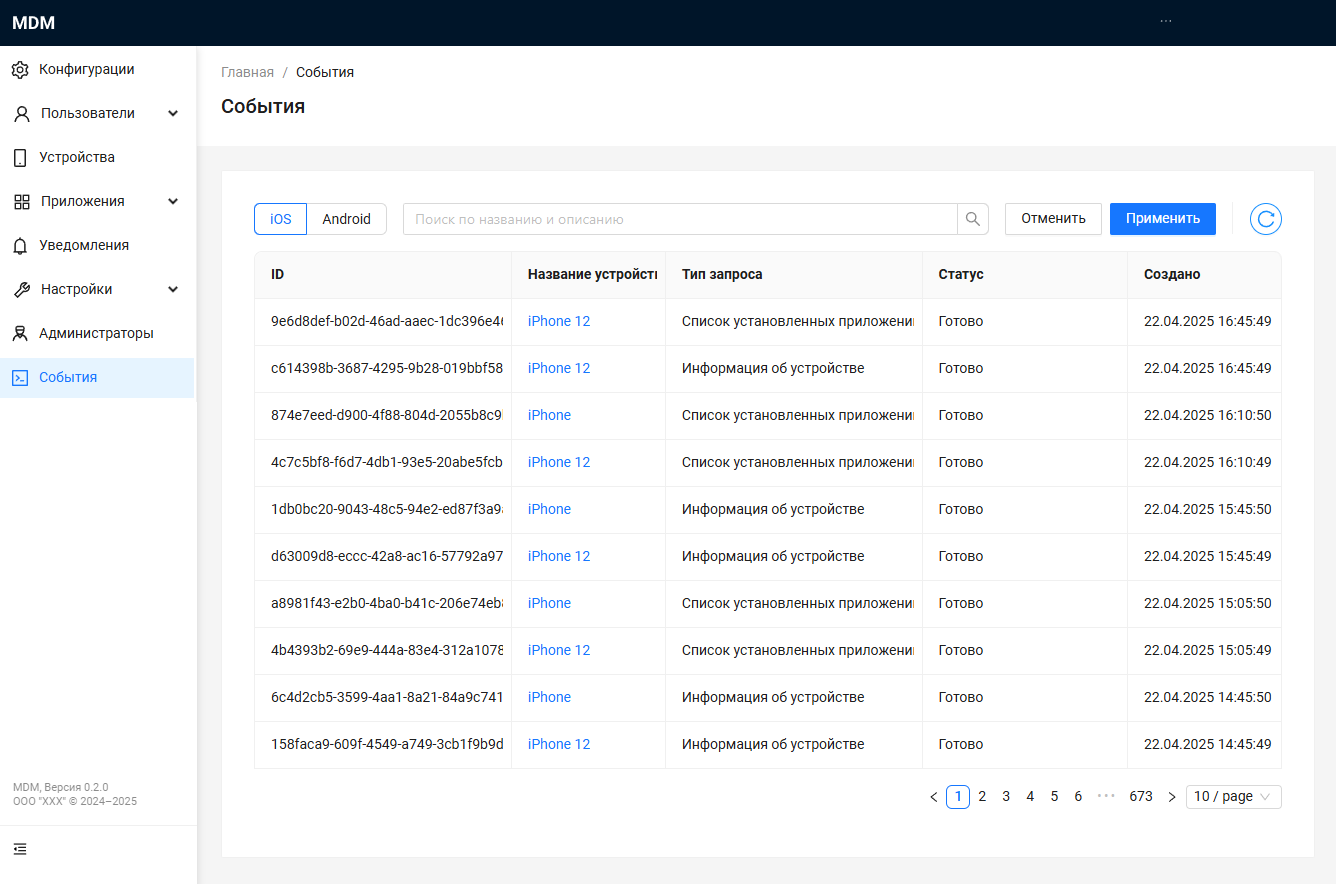 В разделе События администратор может просматривать информацию о событиях, сгруппированных по операционной системе