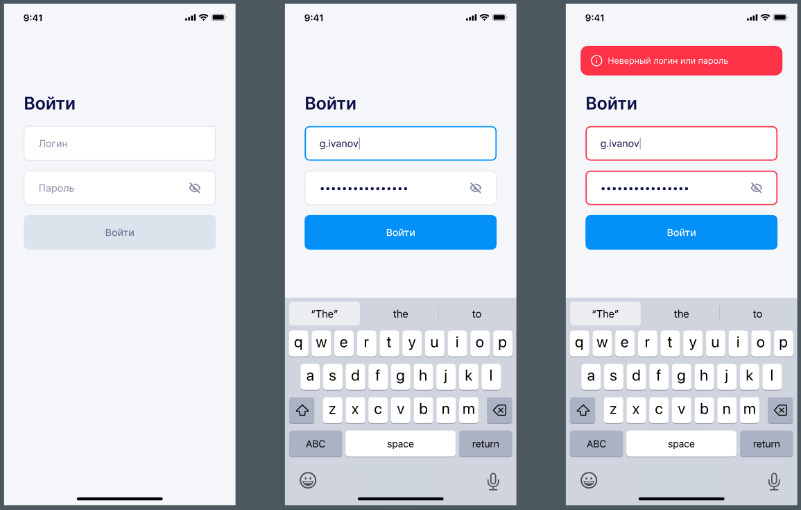 • Поле пароля имеет иконку глаза, позволяющую скрыть или показать вводимый пароль.