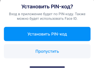 Пользователь может либо согласиться на установку пин-кода, нажав “Установить пин-код”, либо отказаться, нажав “Пропустить”. В дальнейшем, в настройках приложения пользователь может установить или сменить пин-код.