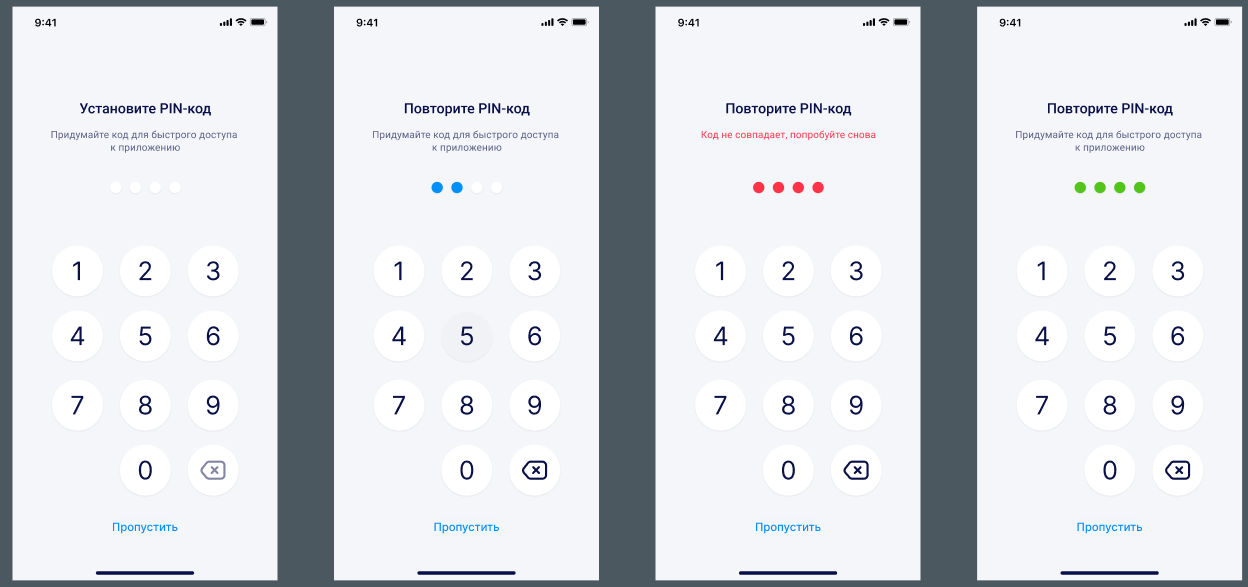 • Если повторный ввод не совпадает с первоначальным, появляется ошибка “Код не совпадает, попробуйте снова” и пользователь должен ввести PIN-код заново.