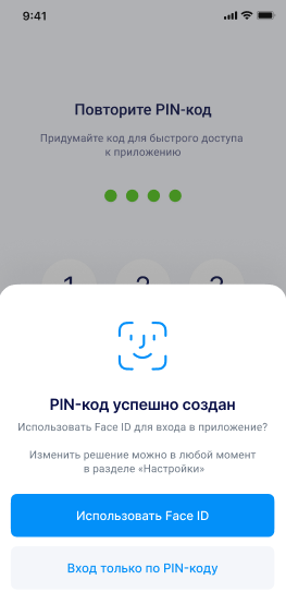 Если пользователь соглашается на установку пин-кода, у него появляется экран ввода с клавиатурой, где нужно ввести четырехзначный PIN-код два раза.