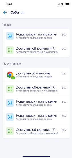 Раздел События в мобильном приложении отображает системные уведомления и уведомления от администраторов.